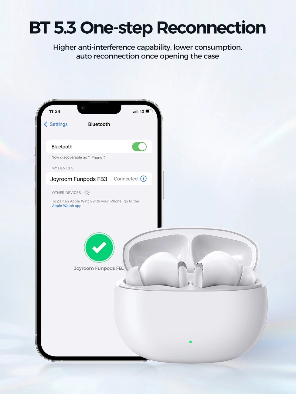 Bluetooth 5.3 für bessere KlangqualitätDank der neuesten Bluetooth 5.3-Technologie bieten die Kopfhörer der Joyroom Funpods-Serie JR-FB3 eine hervorragende Klangqualität ohne Verzögerungen und Störungen. Jetzt können Sie klaren und bassreichen Klang genießen, egal was Sie gerade hören.